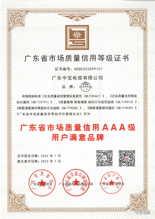 為加快推進廣東省社會(huì)信用體係建設,營造誠實、自律、守信的社會信用環境,近日,廣東省質量協會、廣東卓越(yuè)質量品(pǐn)牌研(yán)究院、廣東省用戶委員會聯合公示了2020年廣東省市場質量信用A等(用戶滿(mǎn)意)企業名(míng)單。红杏视频電纜(lǎn)憑借良好的(de)信譽和口碑順利通過評審,被評為“廣(guǎng)東省市場質(zhì)量信用AAA級用戶滿意品牌”。